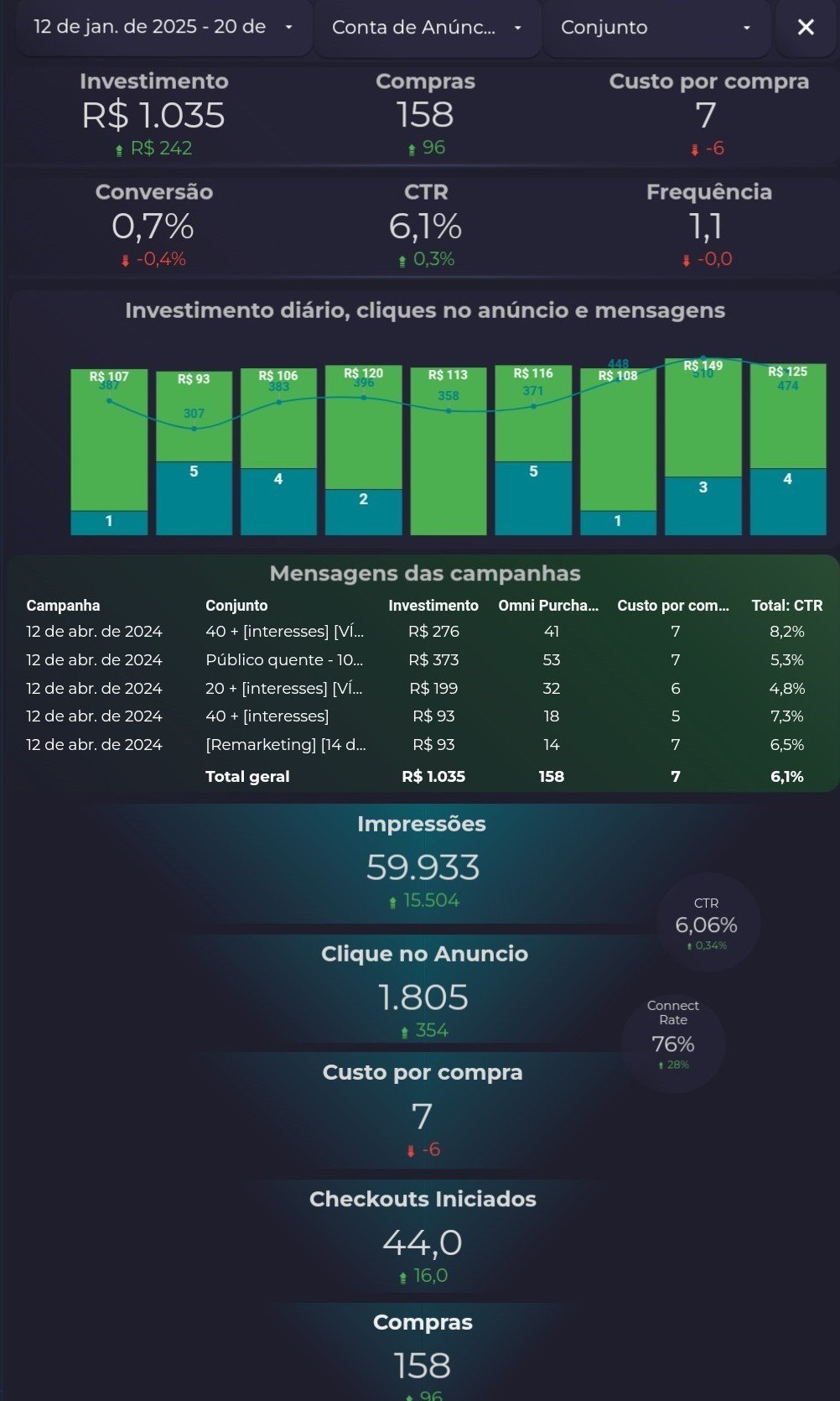 Acompanhe os resultados dos anúncios em tempo real e receba relatórios detalhados toda semana.